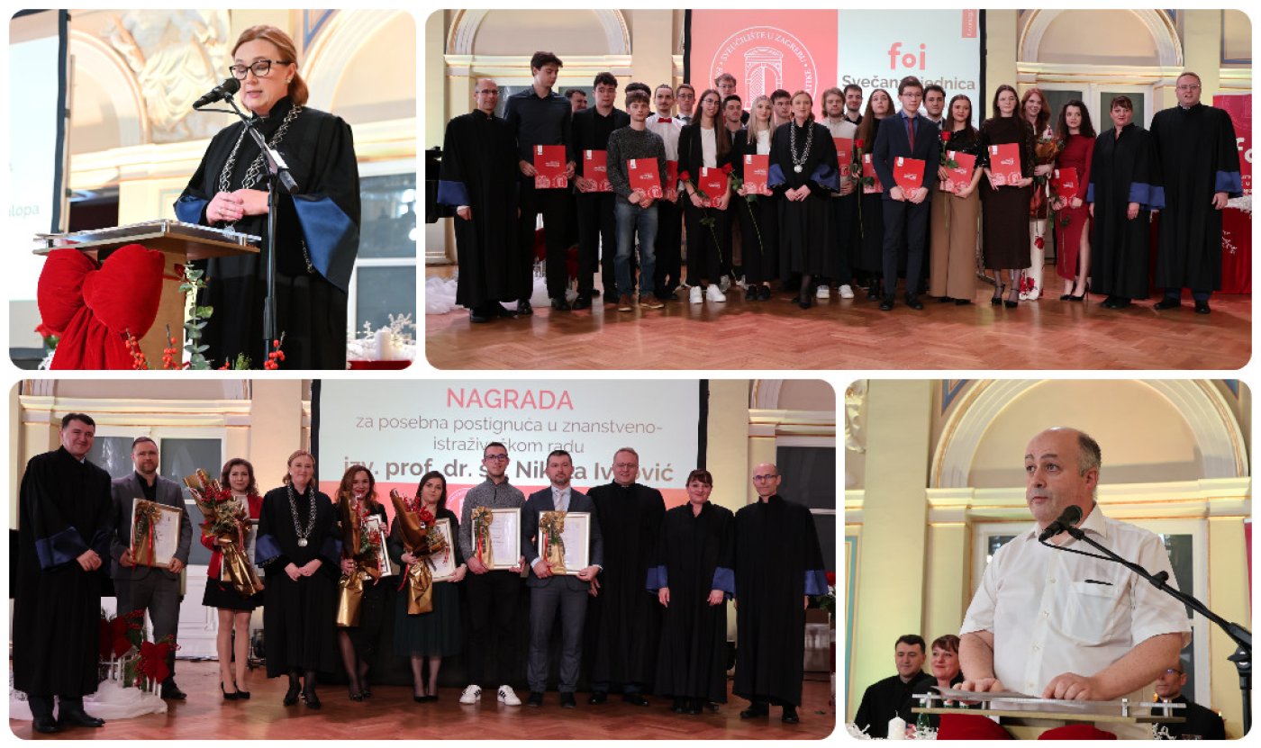 NAGRADE I PRIZNANJA Svečanost je bila i prigoda za dodjelu nagrada, priznanja i povelja istaknutim pojedincima, studentima, zaposlenicima i partnerima FOI-ja. Nagrada za posebna postignuća u znanstveno-istraživačkom radu dodijeljena je izv. prof. dr. sc. Nikoli Ivkoviću, dok je Nagrada za posebna postignuća u nastavnom radu pripala doc. dr. sc. Tamari Šmaguc. Nagradu za izuzetno zalaganje nenastavnom osoblju primila je Romina Kelemen, mag. oec., a Nagrada za predan rad nenastavnom osoblju dodijeljena je Izabeli Oletić Tušek, univ. spec. pol. Priznanje za najbolji znanstveni rad u časopisu s najvećim pokazateljem citiranosti (JCI) dodijeljeno je prof. dr. sc. Igoru Balabanu, a priznanje za volontiranje dodijeljeno je Dariju Ljubasu, univ. mag. inf. Nagrade najboljim studentima prema prosjeku ocjena dodijeljene su: Ani Novak, Ani Rudolf, Anji Kolarić, Dori Kovačević, Eleni Pranjić, Filipu Novaku, Kristini Ćurčiji, Lani Vodanović, Mateusu Matoničkinu, Marini Jendrašić, Nini Lončaru, Noi Midžiću, Patriku Šanteku, Sebastijanu Gečeku i Tihani Triplat. Nagrade studentima za znanstvena, stručna i sportska postignuća primili su: Ana Novak, Benjamin Šmitlehner, Dominik Novak, Fernando Perak, Filip Šoštarić, Fran Sviličić, Fran Wagner, Hrvoje Lukšić, Jan Ivančić, Jan Pintarić, Joshua Lee Fletcher, Josip Ferić, Karla Kulier, Karlo Svetec, Larija Jukić, Laura Kronast, Lora Petrinjak, Lucia Andročec, Maksim Slamek, Matej Čiček, Matija Kljaić, Niko Korać, Nikša Perši, Nino Kostel, Noa Midžić, Paula Cesar, Patrik Šantek, Petra Taradi, Sebastian Arbutina, Stanko Smrček i Tihana Triplat. Posebno priznanje – Povelja "Prijatelj FOI-ja” profesoru Luisu de Marcosu Ortegi, profesoru na University of Alcalá u Madridu, kao posebno priznanje za njegov izniman i dugogodišnji doprinos razvoju međunarodne suradnje, znanstvenoj i nastavnoj izvrsnosti te snažnoj promociji FOI-ja u međunarodnom akademskom prostoru. Njegov kontinuirani angažman, zajednički projekti i akademska suradnja značajno su pridonijeli međunarodnoj prepoznatljivosti FOI-ja. Priznanja za uspješnu poslovnu suradnju s Fakultetom dodijeljena su tvrtkama i institucijama: SICK Mobilisis, Konzum plus, FINA, Apis IT, Solvership, OTP banka, Makerspace, SPAN, Oracle, HBOR, Infodom, JANAF, Aircash, Factory X i HPB. U okviru svečanosti dodijeljene su i zahvalnice partnerskim srednjim školama za dugogodišnju uspješnu suradnju i doprinos obrazovanju budućih studenata Fakulteta organizacije i informatike: Elektrostrojarskoj školi Varaždin, Tehničkoj školi Ruđera Boškovića Zagreb, Srednjoj školi Ivanec, Gospodarskoj školi Varaždin, Ekonomskoj i trgovačkoj školi Čakovec, Tehničkoj školi Čakovec, Tehničkoj školi Sisak i Prvoj gimnaziji Varaždin.