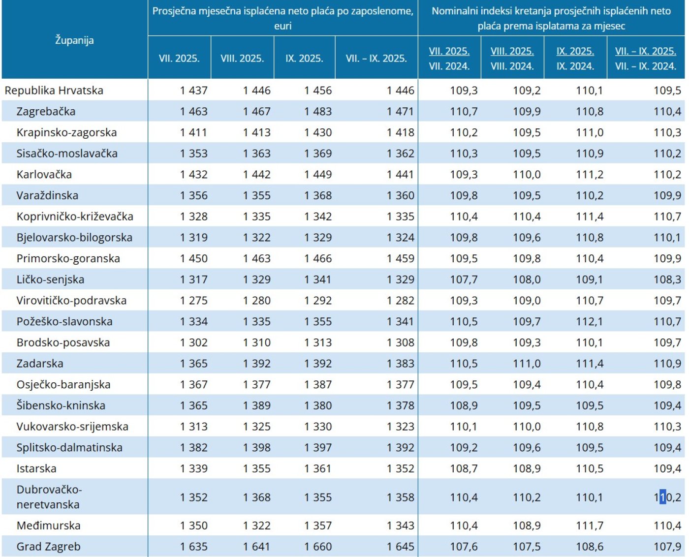 Prosječna mjesečna isplaćena neto plaća po zaposlenome u pravnim osobama u trećem tromjesečju 2025. u odnosu na isto razdoblje 2024. porasla je u svim županijama. Najviše je porasla u Zadarskoj županiji, za 10,9%, a najmanje u Gradu Zagrebu, za 7,9%. Međutim, najviša prosječna mjesečna isplaćena neto plaća po zaposlenome u pravnim osobama bila je i dalje u Zagrebu. U trećem tromjesečju je iznosila 1.645 eura. a najmanja u Virovitičko-podravskoj županiji, u iznosu od 1 282 eura.