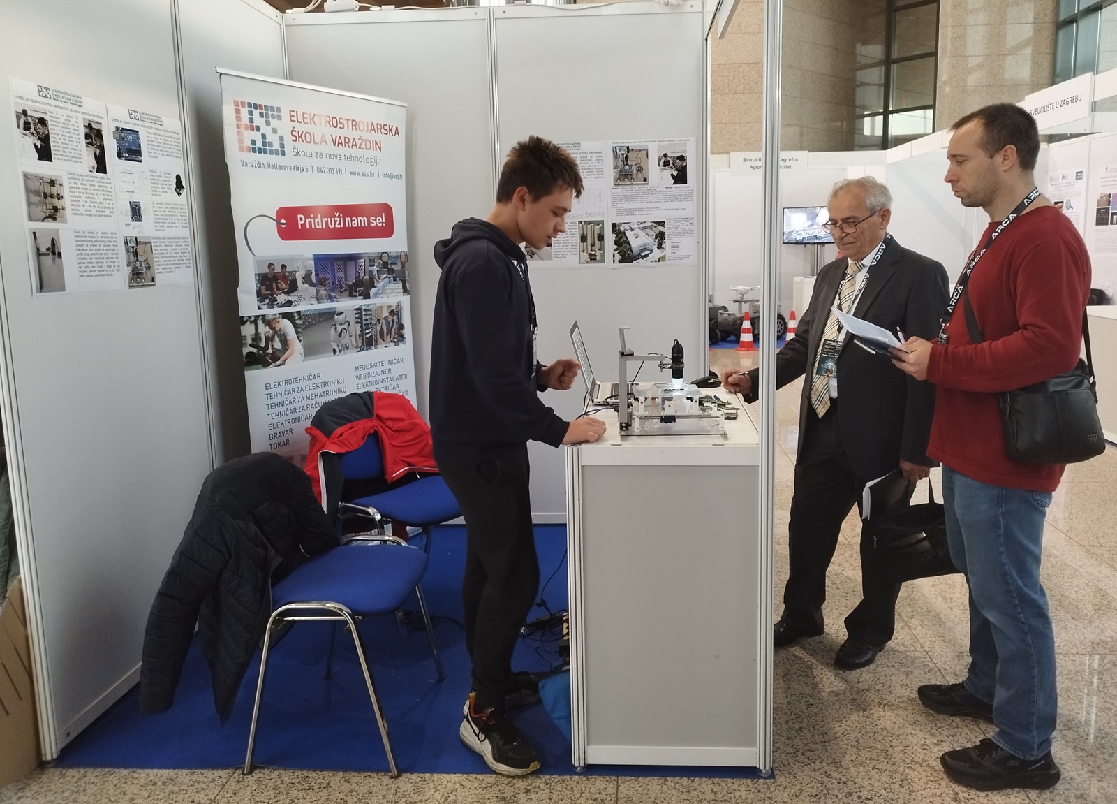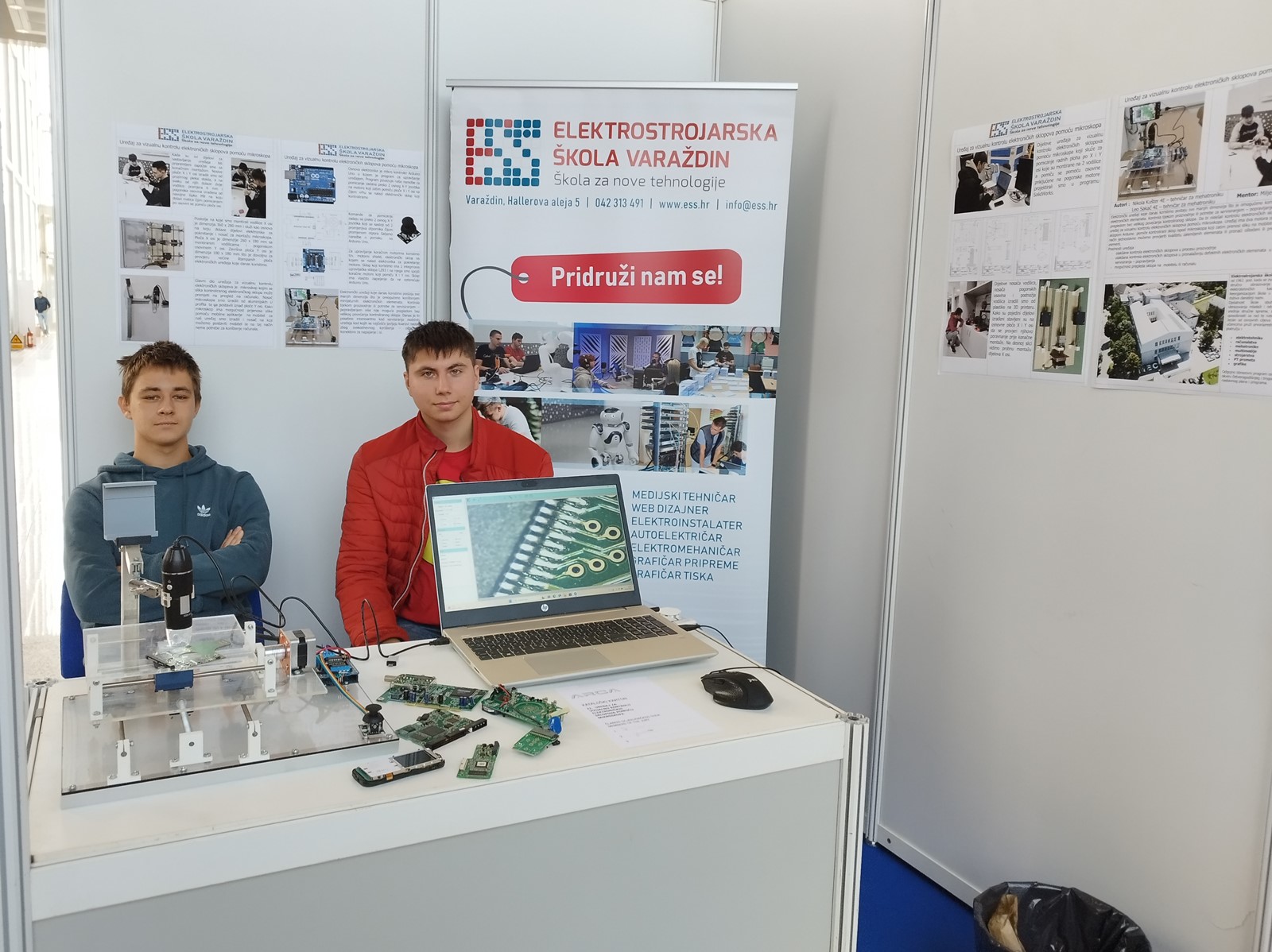 Učenici 4.e razreda Nikola Kušter i Leo Sakač polaznici zanimanja tehničar za mehatroniku na izložbi su predstavili svoj rad „Uređaj za vizualnu kontrolu elektroničkih sklopova pomoću mikroskopa“. Tijekom četvrtka i petka izloženi rad je prezentiran članovima prosudbenog povjerenstva i mnogobrojnim posjetiteljima izložbe koji su izložene radove mogli pogledati od 10.00 do 18.00 sati.