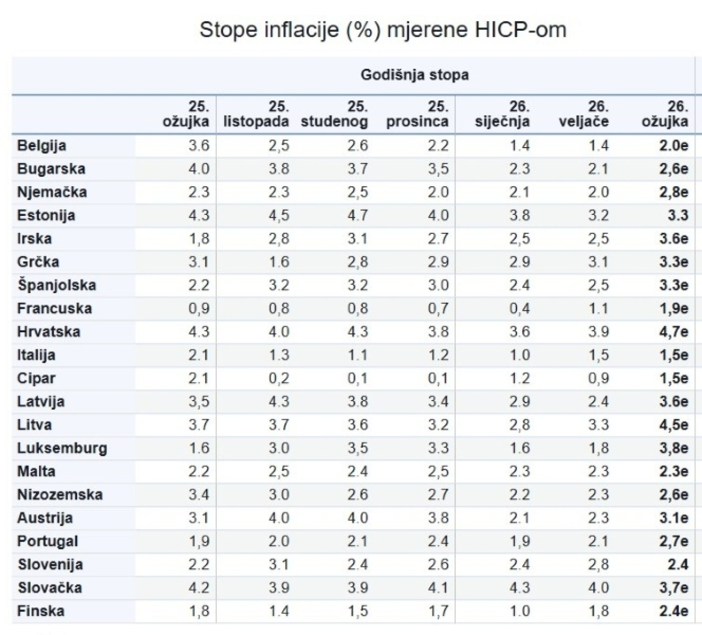 Eurostat, statistički ured Europske unije, objavljuje procjenu inflacije u eurozoni na kraju svakog mjeseca, dok se potpuni skup harmoniziranih indeksa potrošačkih cijena (HICP) za europodručje, EU i države članice objavljuje sredinom mjeseca koji slijedi nakon referentnog mjeseca.