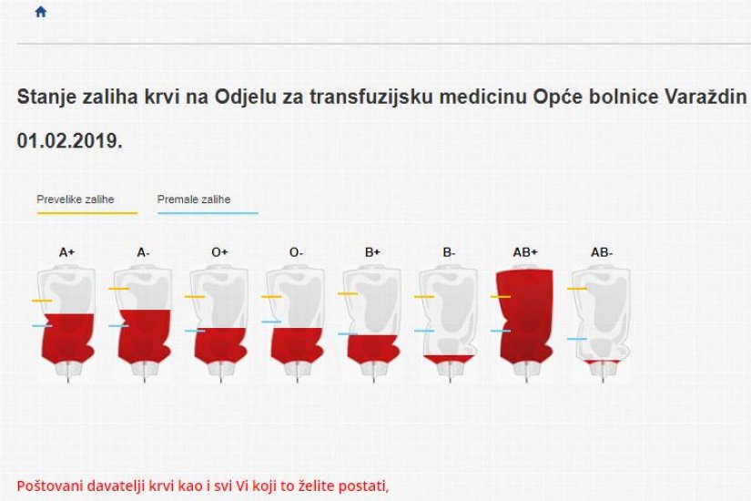 Sudeći po stanju u petak, 1. veljače, Odjelu za transfuzijsku medicinu najviše nedostaje krvi krvne grupe AB- i B-, no premale su doze i krvi krvne grupe 0- te B+.