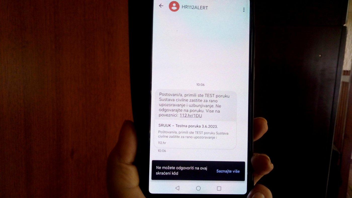 SMS poruka pošiljatelja HR112ALERT, bila je sljedećeg sadržaja: „Poštovani/a, primili ste TEST poruku Sustava civilne zaštite za rano upozoravanje i uzbunjivanje. Ne odgovarajte na poruku. Više na poveznici: LINK“.