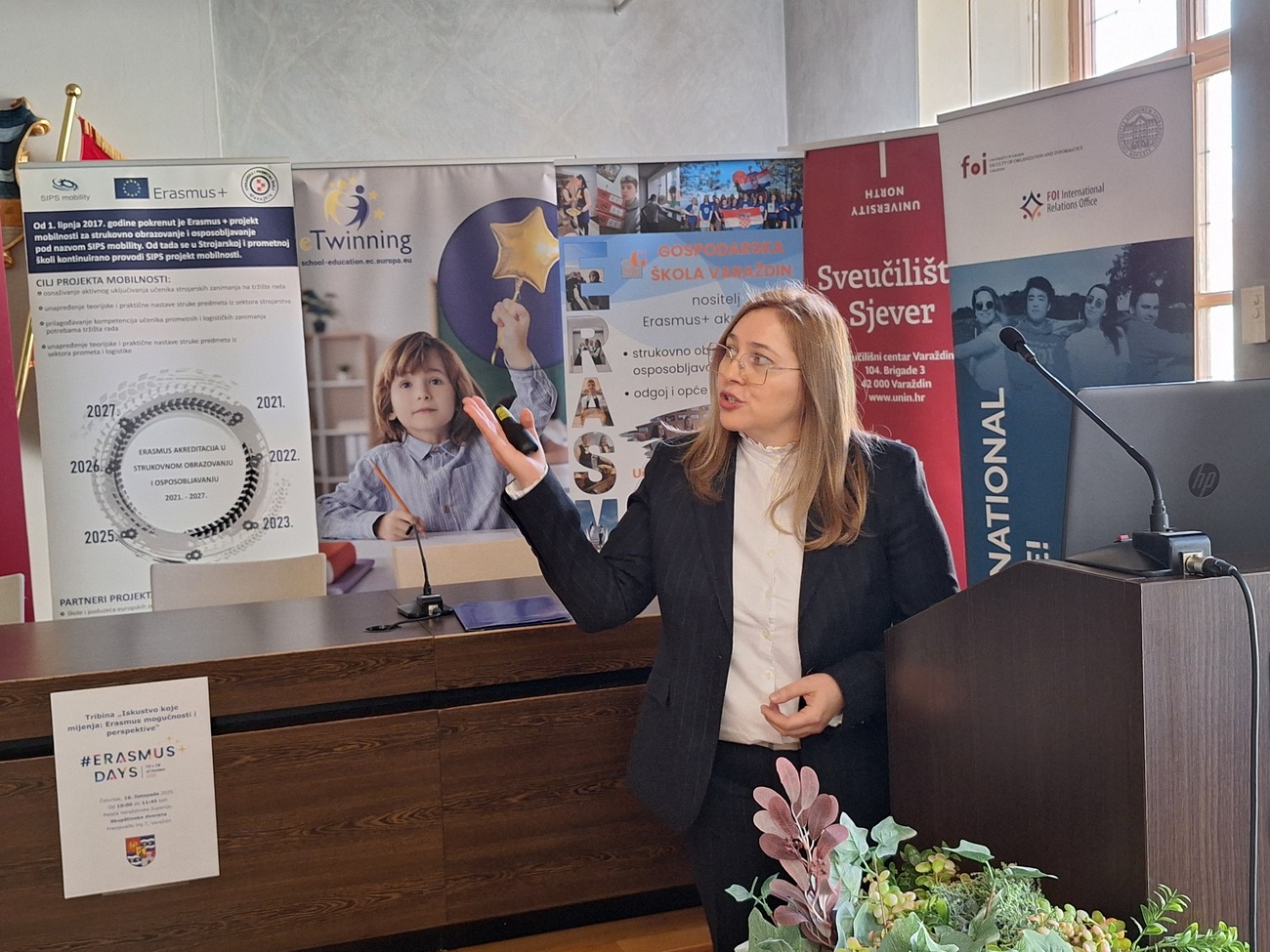 O Erasmus+ programu i njegovoj povezanosti s eTwinning platformom govorile su Ana Marketin-Sedlar, prof. savjetnik strojarske skupine predmeta u Strojarskoj i prometnoj školi Varaždin te ambasador eTwinninga, i Mirela Pocrnić, mag. inf., koordinatorica Erasmus+ projekata mobilnosti u istoj školi.