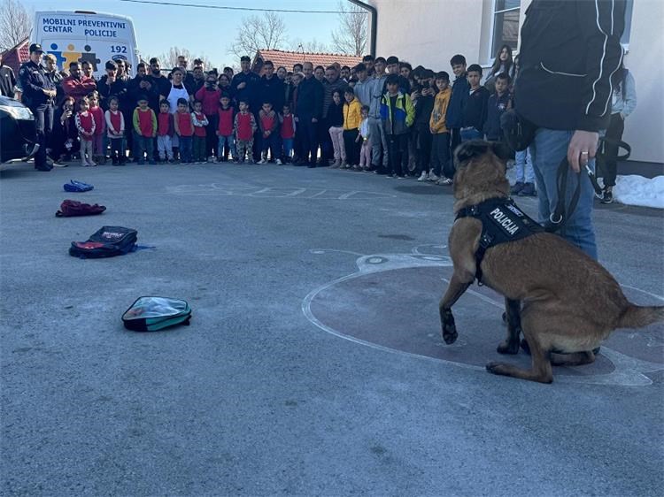 Nakon edukativnog dijela, učenicima se predstavio policijski službenik - vodič službenog psa za detekciju droga, a poseban interes izazvao je službeni pas koji je kroz pokaznu vježbu demonstrirao način otkrivanja skrivene droge. Policijski službenik na zanimljiv je način približio djeci kako izgleda radni dan sa službenim psom.