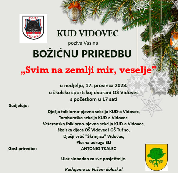 U nedjelju, 17. prosinca, u školsko sportskoj dvorani u Vidovcu s početkom u 17 sati održat će se božićni koncert Kulturno umjetničkog društva Vidovec "Svim na zemlji mir, veselje".