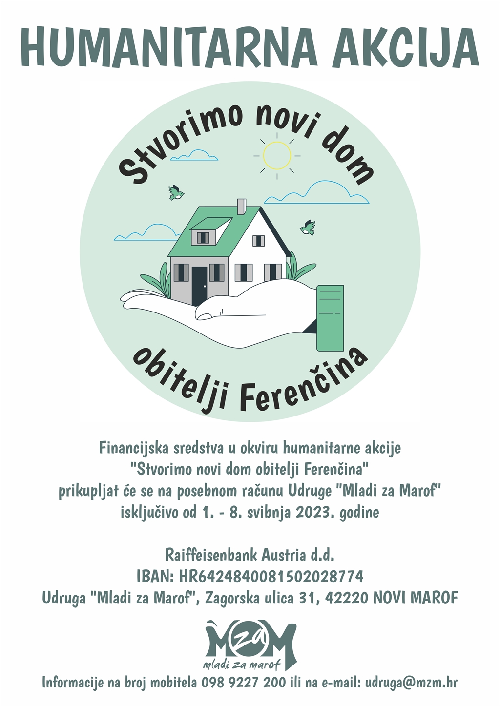Dosad je prikupljeno 15.500 eura, a humanitarna akcija traje do ponedjeljka, 8. svibnja do 15 sati. Financijska sredstva prikupljaju se na posebnom računu Udruge „Mladi za Marof” otvorenom kod Raiffeisenbank Austria d.d. (IBAN: HR6424840081502028774) samo za potrebe humanitarne akcije „Stvorimo novi dom obitelji Ferenčina“.