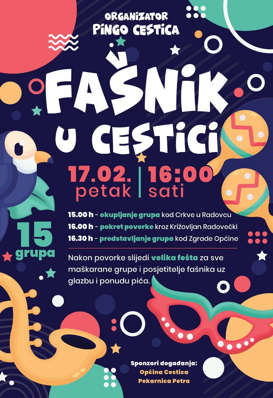 Maskirana povorka krenut će u 16 sati od crkve u Radovcu, kroz Križovljan Radovečki prema zgradi Općine, gdje će načelnik Općine Cestica tradicionalno predati vlast. Uz fašničke spelancije i huncutarije, održat će se velika fešta uz glazbu i bogatu gastronomsku ponudu.
