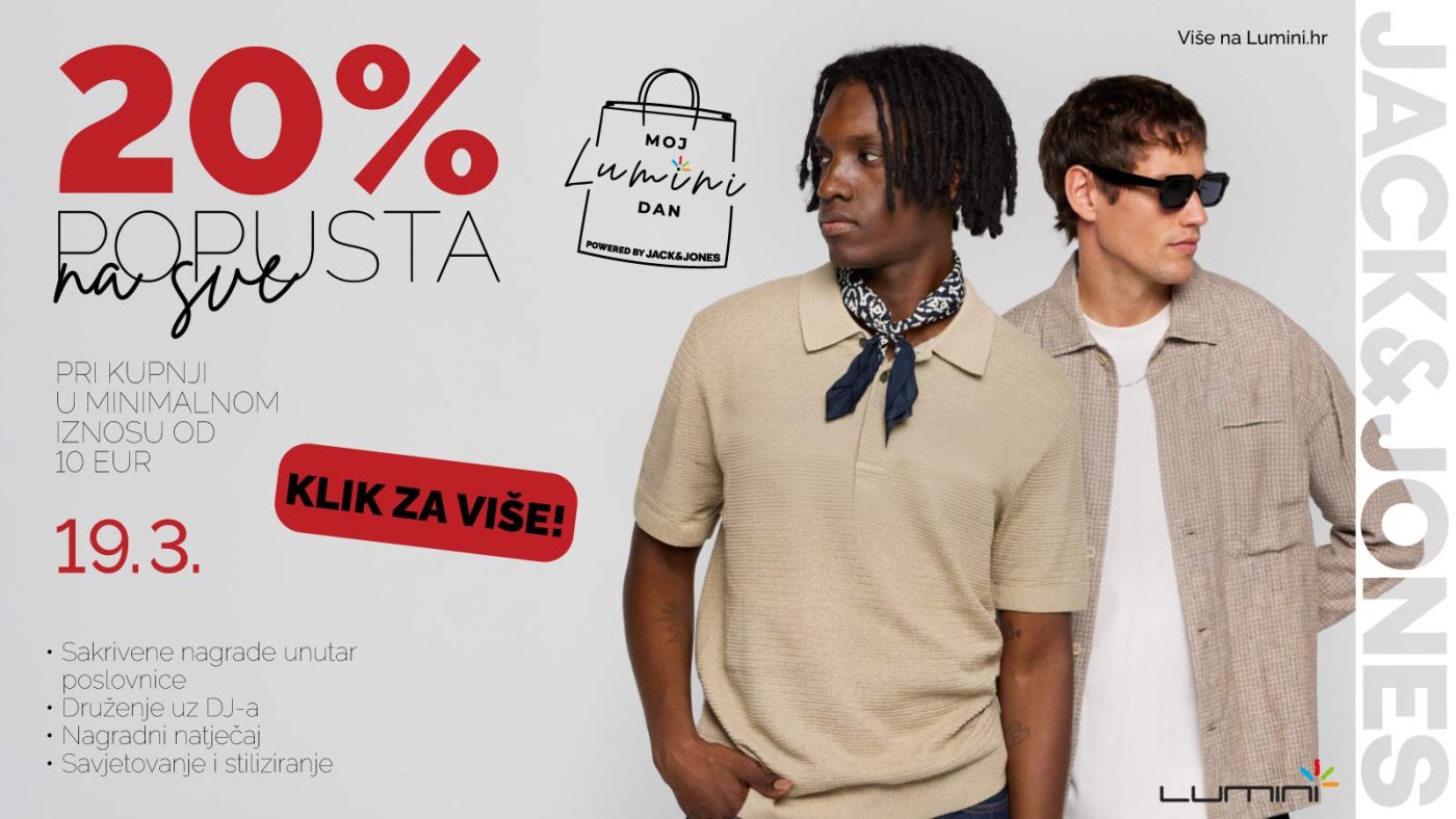 Ljubitelje mode, dobrog shoppinga i popusta ovog četvrtka, 19. ožujka, u Lumini centru očekuje event Moj Lumini dan, u suradnji spopularnim brendom Jack & Jones. Tijekom cijelog dana posjetitelji će imati priliku među prvima istražiti najnovije kolekcije koje donose suvremene modne komade karakteristične za prepoznatljiv stil brenda Jack & Jones. Uz to, tijekom cijelog dana bit će aktivno i 20% popusta na sve uz minimalnu kupnju od 10 eura, što je idealna prilika za osvježavanje garderobe i pronalazak novih omiljenih komada po još boljim cijenama.